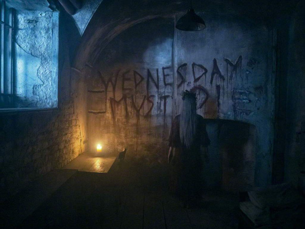 事实上,奥菲莉亚这个人物早在第二季结尾就已悄然登场。在祖母赫斯特家的地窖里,一个身披黑袍、声音低沉的女性背影首次现身,并与反派劳蕾尔·盖恩斯产生神秘关联。当时镜头刻意未展示其面容,只是墙上用血写下了“星期三必须死”的恐怖信息。如今谜底揭晓——这位神秘姨妈,正是由伊娃·格林饰演。