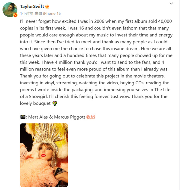 纪录诞生的当晚,泰勒在社交平台发布长文,将镜头拉回2006年的起点:“我永远忘不了首张专辑首周卖出4万张时的雀跃……那时我16岁,无法想象竟有这么多人愿意为我的音乐投入时间与热情。”而19年后,“比当年多百倍的人在这周为我而来”。