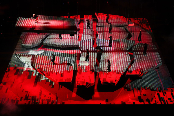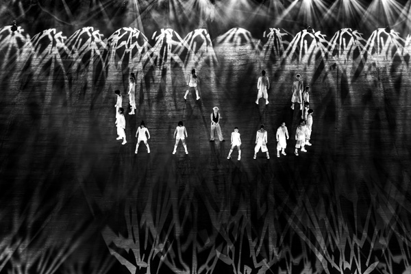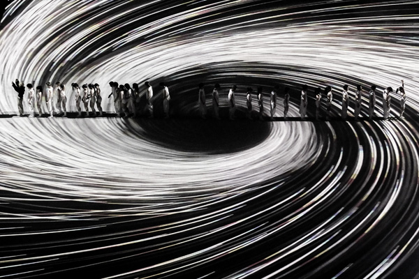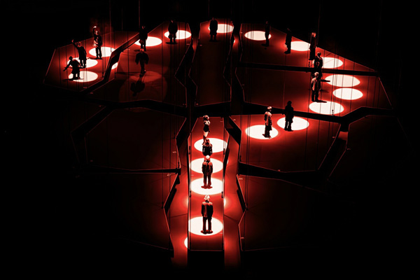 取消传统舞台并非意味着表演的降级,而是对表演维度的升维探索。在周震南的舞台空中藏着十二片可以从天而降的龟裂形态的空中舞台结构,观众入场时无法看到它。它像尚未被察觉的信念与觉知,被暂时悬置在视野之外。龟裂并非破坏,而是意识在经历迷雾、反复、自省之后,自然产生的裂缝。这些裂缝,让光、影、声音与情绪得以渗入。