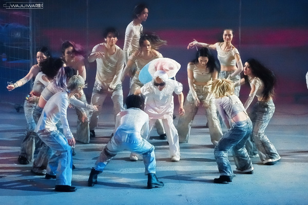 在“没有舞台”的舞台上,表演者本身也成了最大的动态元素。为了确保这种动态表演的观演公平,周震南展现了强大的控场能力,对每首歌的走位都进行了精心的设计,带领着舞团游走于现场嗨歌互动,引得现场高潮迭起,尖叫连连。
