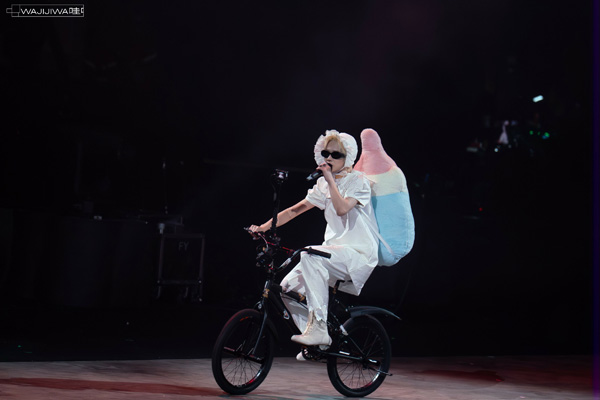 演出的收尾部分再次彰显了周震南大胆的艺术表达。在模拟为废旧停车场的场景中,他身着婴儿服,背着巨型奶瓶,骑着儿童车登场进行说唱。这一充满超现实反差感的造型,展现了周震南作为新一代音乐人对传统身份标签的大胆解构。