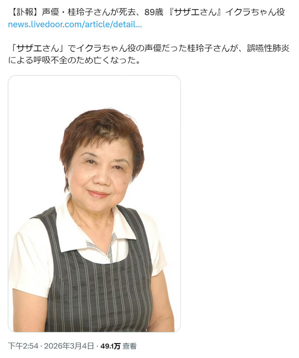 据日媒报道,为《聪明的一休》女主角小叶子配音的日本资深声优桂玲子,已于2月22日上午9时33分因误吸性肺炎导致唿吸衰竭去世,享年89岁 。