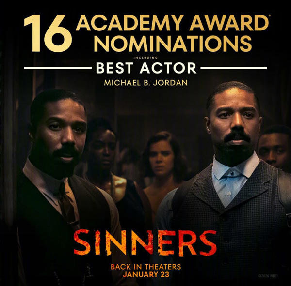 《罪人》此番入围了包括最佳影片、最佳导演、最佳男主角(迈克尔·B·乔丹)、最佳原创剧本在内的16个奖项,超越了此前《泰坦尼克号》《爱乐之城》等14项提名的纪录,创造了奥斯卡历史新篇章。